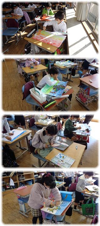 3年生が図工で、画用紙を背景に鳥が羽ばたく平面作品を作っていました。