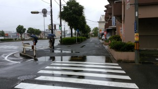 この日の朝は、夜の間に降った雨があちこちで大きな水たまりを作っていました。特に、バローの前の交差点の1か所は、排水溝に水が流れないため、10cmほどの深さの大きな水たまりになっていました。教育委員会に連絡し、市役所内で協議いただいています。(後日、改善するという返事がありました)