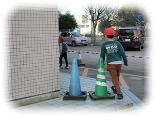 昇降口から運動場へ向かう角にコーンを置きました。