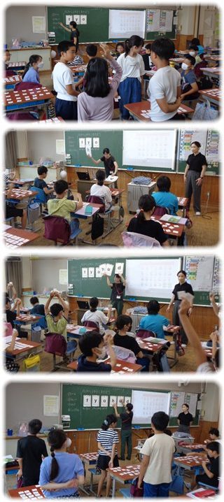 教師が、アルファベットのかかれたでっかいカードを掲げると、同じカードを探して上げていきます。