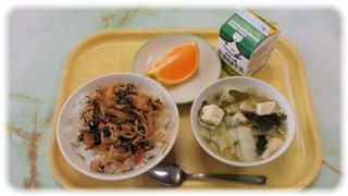 メニューは、三重豚のキムチビビンバ、豆腐とわかめのスープ、牛乳、そしてデザートにデコポン。
