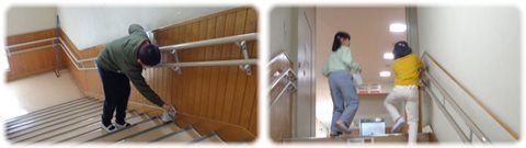 1人が湿らせた新聞紙で、もう1人がその後を乾いたぞうきんで。合わせ技で手すりをきれいにするペア。