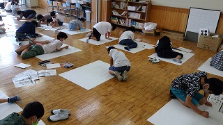 6年生の授業を見に行くと、多目的室で一人1枚の模造紙に、何やら書いています。国語の授業の中で、ポスターセッションの学習があり、防災をテーマに自分で調べたことをまとめていました。新しい教科書になり、新しい学習指導要領になて、合科的教材が増えたように思います。