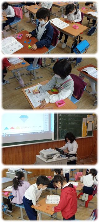 色板や数え棒を使って、また、点と点を線でつないで、いろいろな形を作ります。