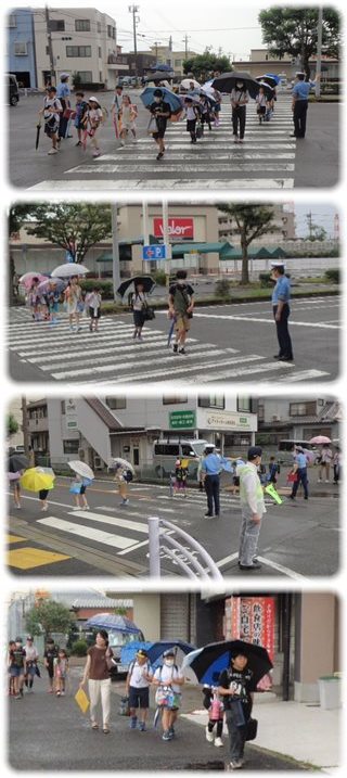 北から南から、傘をさして歩いてくるどもたちは、一列に並んで歩道を歩き、横断歩道で信号待ち。