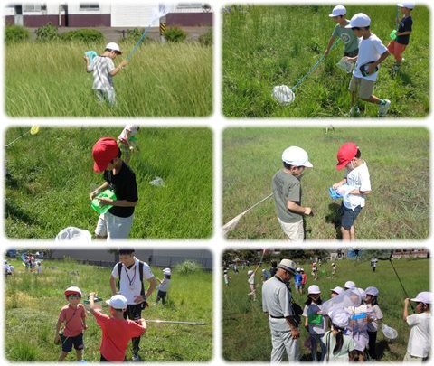 子どもたちは、時々水筒のところに戻って乾いたのどを潤し、網を持って駆けずり回り、小さくて素早い動きの虫たちと格闘していました。