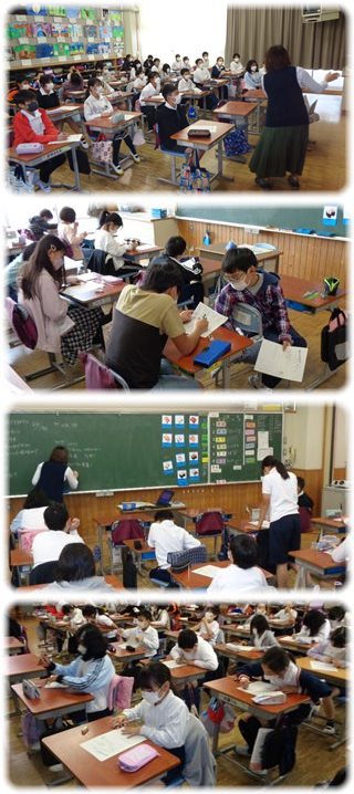 子どもたちは、配られた献立表を見て魚の名前がないか懸命に探します。近くの子と一緒に探す子も。