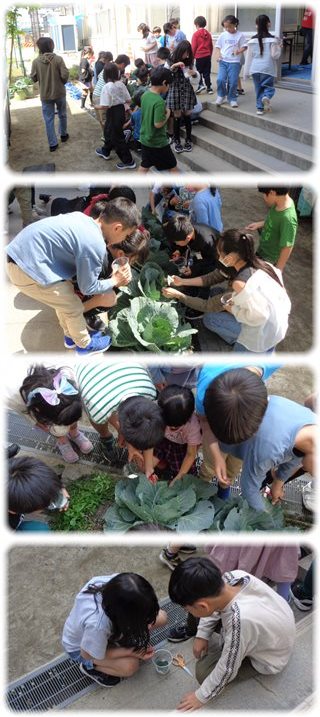 そのキャベツ畑に3年生が群がっていたので見に行くと、子どもたちははさみを持って、キャベツの葉っぱをかき分けていました。