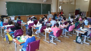 ミートスパゲッティの日で、お口の周りはオレンジ色!!お口が2倍くらいの大きさに見えました。「小学校の給食はおいしいですか?」と尋ねると、「うん、おいしいよ。」と笑顔で答えてくれました。給食の調理員さんに伝えました。