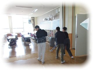 低学年の教室へもまわって、給食配膳台をきれいにしたり、