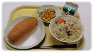 メニューは、地物たっぷり五目うどんとさつまビーンズ、小型玄米パン、そして牛乳です。