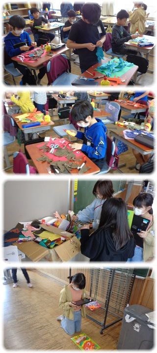子どもたちは、時折、教室の前に行っては、端切れがいっぱい入った箱から欲しいものを選んで持っていきます。