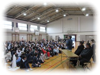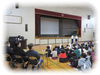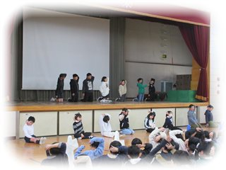 高学年の保健委員が、これまで調べたことや考えたことをもとに、軽妙な語りで進め、参加した3年生以上のこどもたちも楽しく聞き入っていました。