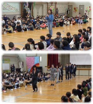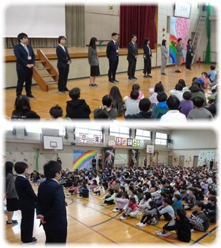 前に並んだ教職員が1人ずつ、ある者は浜田小での思い出を語り、ある者は子どもたちへの餞の言葉を語るのを、子どもたちは、目をつないでじっと聴き、それが終わると、「ありがとう」と「さようなら」の気持ちを込めた、大きな拍手を贈っていました。