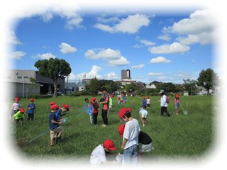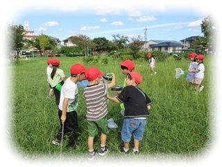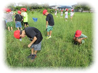以前2年生が行ったときよりも、草がさらに伸びていて、いつの間にかズボンに「ひっつき虫」がいっぱい!という子もいて、虫取りよりひっつき虫とりに夢中になる姿もありました。こういう時も、お友だちと一緒にする姿がほほえましいです。