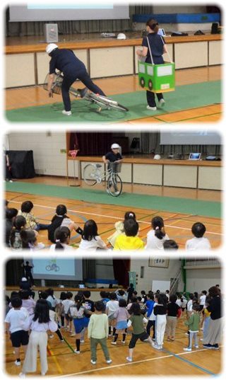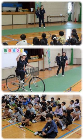 2年生が、四日市市の「とみまつ隊」の指導員を招いて、交通安全教室を開き、町を歩いているときや自転車で移動しているときに守ること、気をつけることを学びました。