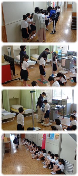 名列順に並び、身長計の後ろに置かれた足跡マークの上に立って順番を待ちます。