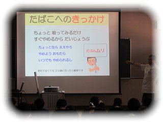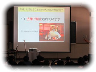 たばこよりも身近にあり、誘惑の危険も多いが、やはり身体への影響は大きいこと、成人年齢は18歳になったけど、たばこもお酒も変わらず20歳まで認められないのは、健康を守るためであることをお話しくださいました。