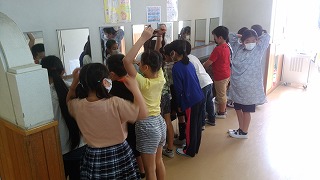 そして、各担任の先生から新しい学校生活様式のお話を聞きました。学校へ登校をした時、休み時間になった時、掃除の後など、何かの活動の後には手洗い・うがいです。手洗い・うがいの順番を待つ時も、後ろの子は離れてくださいね。