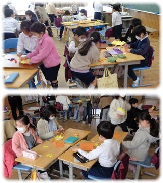 2年生の教室を覗くと、どの学級も画用紙や折り紙で何やら作っていました。