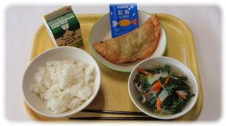 メニュー:津ギョーザ、春雨スープ、米飯、魚ふりかけ、牛乳