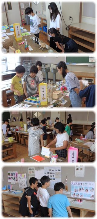 2時間目に作品が展示されている3つの教室を見て回ると、低学年の作品を4年生が鑑賞しているところに出会いました。