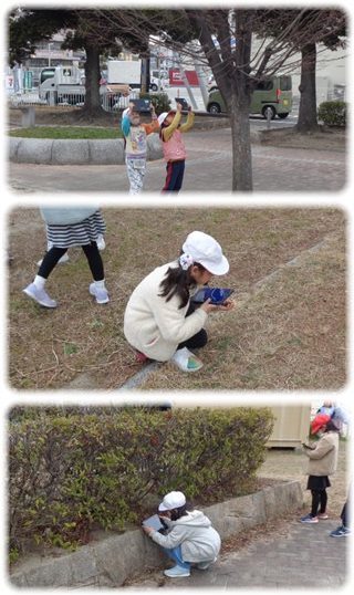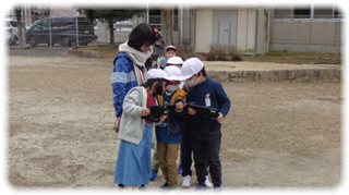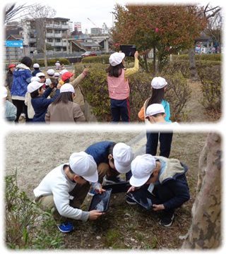 子どもたちは、“冬”を見つけると、タブレットで撮影し、「見て、見て」と担任に、どこでどんなものを見つけたか話していました。