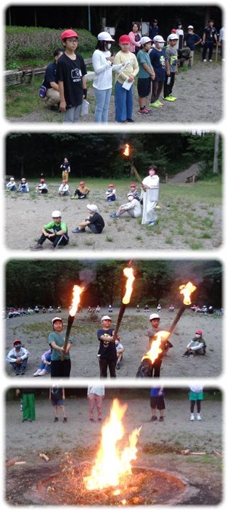 そこへ、火の灯ったトーチをかざした“火の精”がやってきて、みんなの周りを一周し、“営火長(校長)”の前へ。