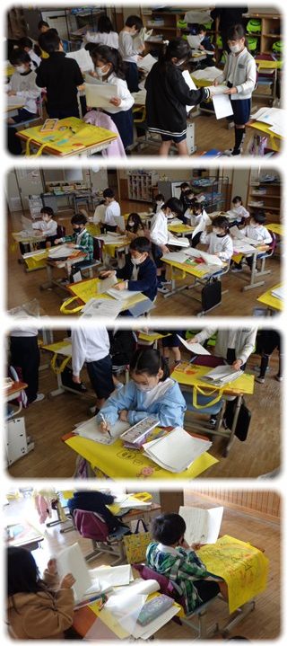 これまでの学習で作った作品や記録など、教室に残しておいたものが、子どもたちに返されました。
