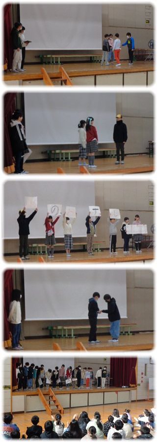 今日は、“運営委員会”の5,6年生が、冬休みに気をつけることを、3つの劇にして全校のみんなに伝えました。