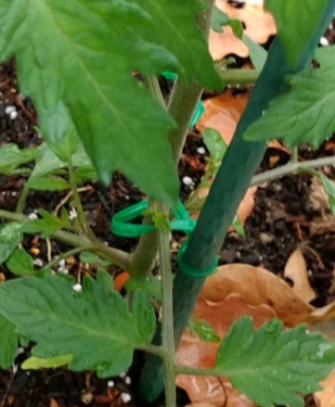 支柱と苗を8の字に結びたいです。また、茎も太くなることを考えて結んでくださいね。1週間でかなり大きくなりました。カバーの袋より背丈が高くなる頃に、上の方でもう一カ所ひもで結びます。その頃にはわき芽が出てきます。植木鉢で育てるときは、わき芽をかいていった方が、しっかりと実をつけさせる事ができますよ。わき芽をかいたあと、そのわき芽を水につけておくと、根が出てきて、挿し木ができます。ミニトマトの苗を増やすこともできます。