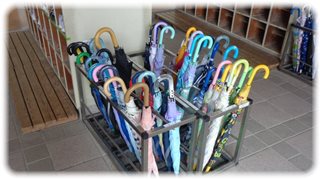 一部、倒れたり斜めになっているものもありますが、それは、整頓された後に登校してきた子の傘でしょう。