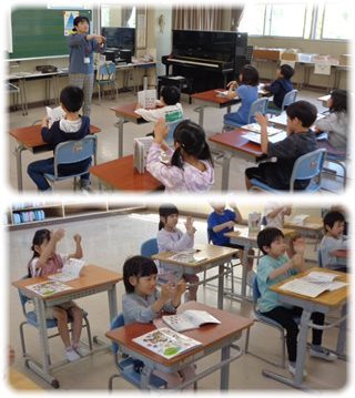 まずは教師のお手本を見て、次に、教師がゆっくり歌う歌に合わせて、手遊びを練習。