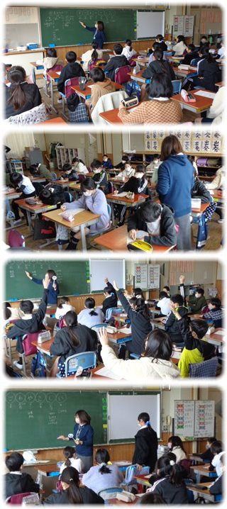 教師が、袋の中から取り出した札に書かれた、文字の仲間を子どもたちが答えていきました。