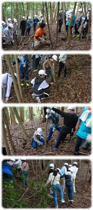 日頃、舗装された平らな道を歩き慣れている子は、慣れない山の中の土むき出しで滑る斜面を怖く感じるのでしょう。