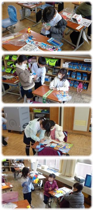 何度も箱のふたになる部分をめくるようにして見ている子に話しかけると、早く次の活動をしたいのに、なかなか接着しなくでもどかしい様子だったので、接着面にボンドを足して押さえ、