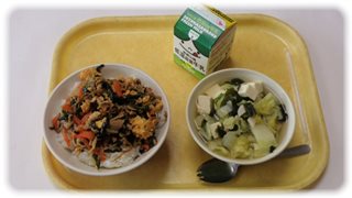 メニューは、三重豚のビビンバ、牛乳、豆腐とわかめのスープ。
