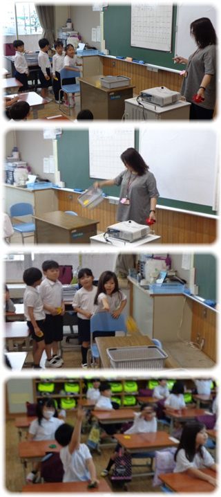並んだ子どもたちは、1人ずつ順番に教卓の上のかごをめがけて、おはじきをポイ。