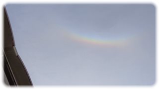 朝、出勤して天を仰ぐと、なんと、朝日の上に虹がかかっているではありませんか。