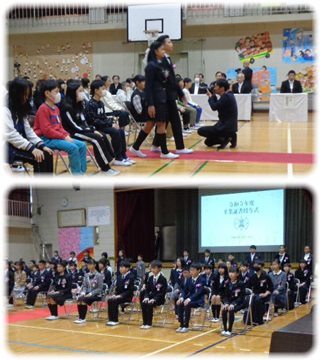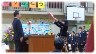 と、お礼の言い、“卒業証書フォルダー”と、この式や6年生を送る会などの様子を収めたDVDの見本を受け取りました。