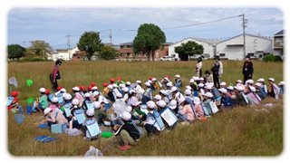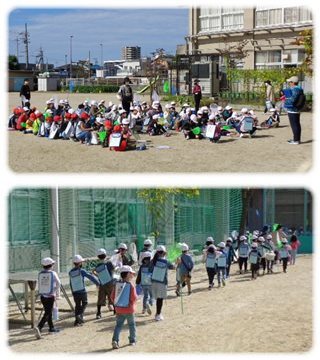 運動場に並んだ子どもたちは、教師から道中気をつけることなどの話を聞いて、虫たちが待つ新正中公園へ向かいました。