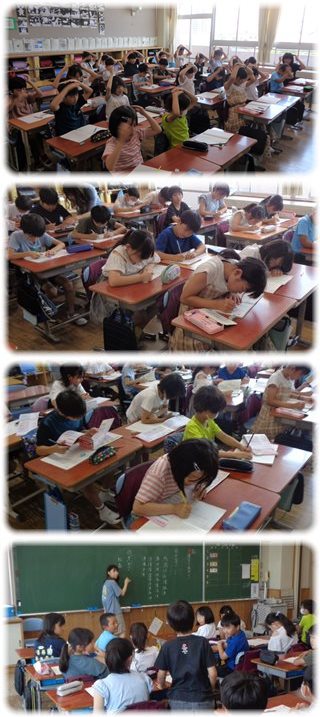 子どもたちは、両手を頭の上で組んで待ちます。