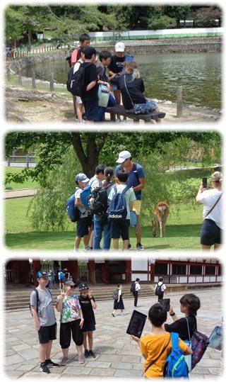 鏡池の南で大仏殿を背景に学級写真を撮り、南大門で、阿吽の呼吸で向かい合う仁王像を見学して、バスターミナルへと向かいました。