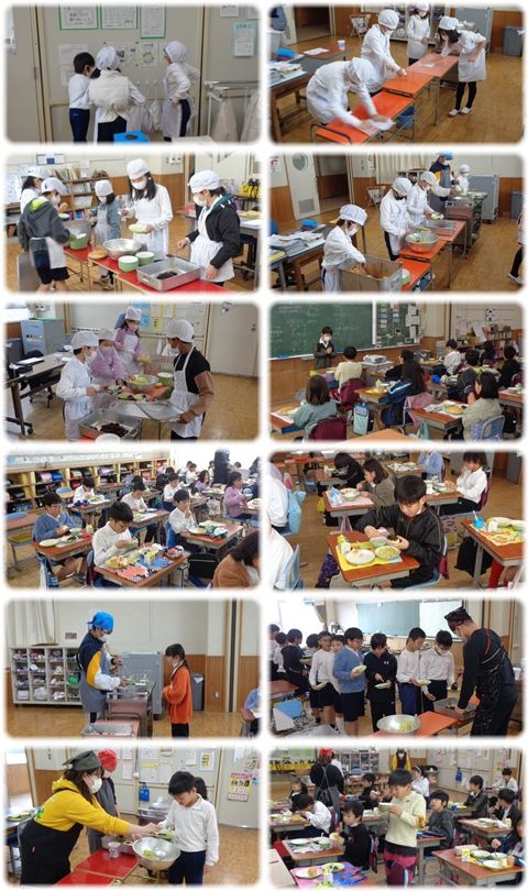 今日の給食は「昭和20年代」の給食を再現したもので、コッペパンやクリームシチュウとともに「くじら」が登場しました。