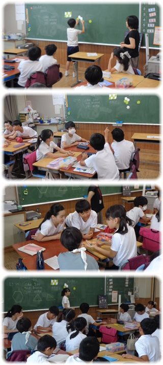 教師が、緑と白の形が同じ四角形を辺と辺、頂点と頂点が重なるように並べていくと、隙間なくきれいに敷きつめることができました。
