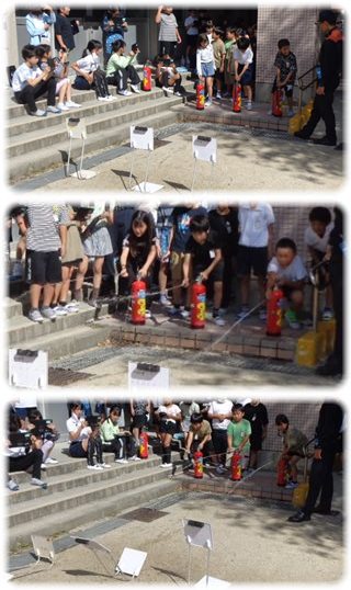 3人ずつ消火器の前に立って消火活動開始。