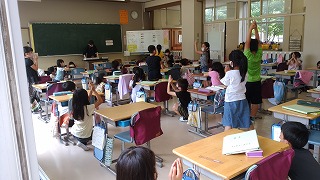 3年1組の音楽の様子をのぞいてみました。すると、みんながしゃがみ込んでいました。石田先生の奏でるリズムに合わせて、自分で感じたように徐々に伸びあがってくる子どもたち。リズムを感じたままに表現しているようです。歌唱指導を避ける形での音楽の授業を試行錯誤しながら進めてもらっています。