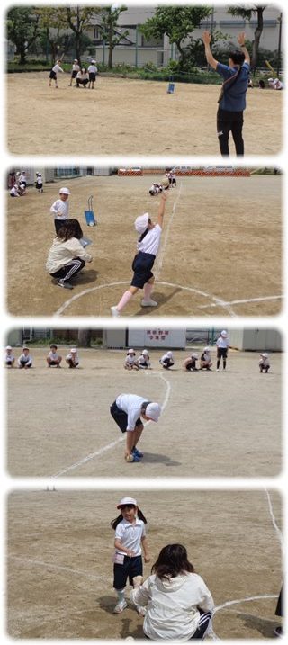 事前に、高く投げる方が遠くへ飛ぶことを、教師の実演も見て学んだのですが、そんなに簡単にはいかないようです。