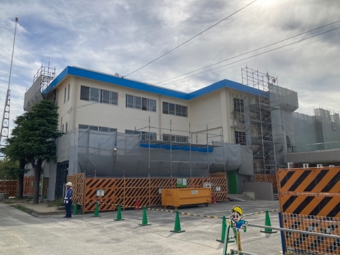7月31日(月)、校舎内の作業の音に交じって、午後には職員室の北側から足場を解体するにぎやかな音(声も含む)が聞こえていました。足場の一部が撤去されました。