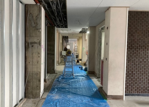 職員室側から見た廊下。校長室の廊下側の壁とドアがなくなり、仮設された仕切り壁が見えています(左側)。仕切り壁に続いて立派なコンクリートの柱がむき出しになっています。(14:21撮影)